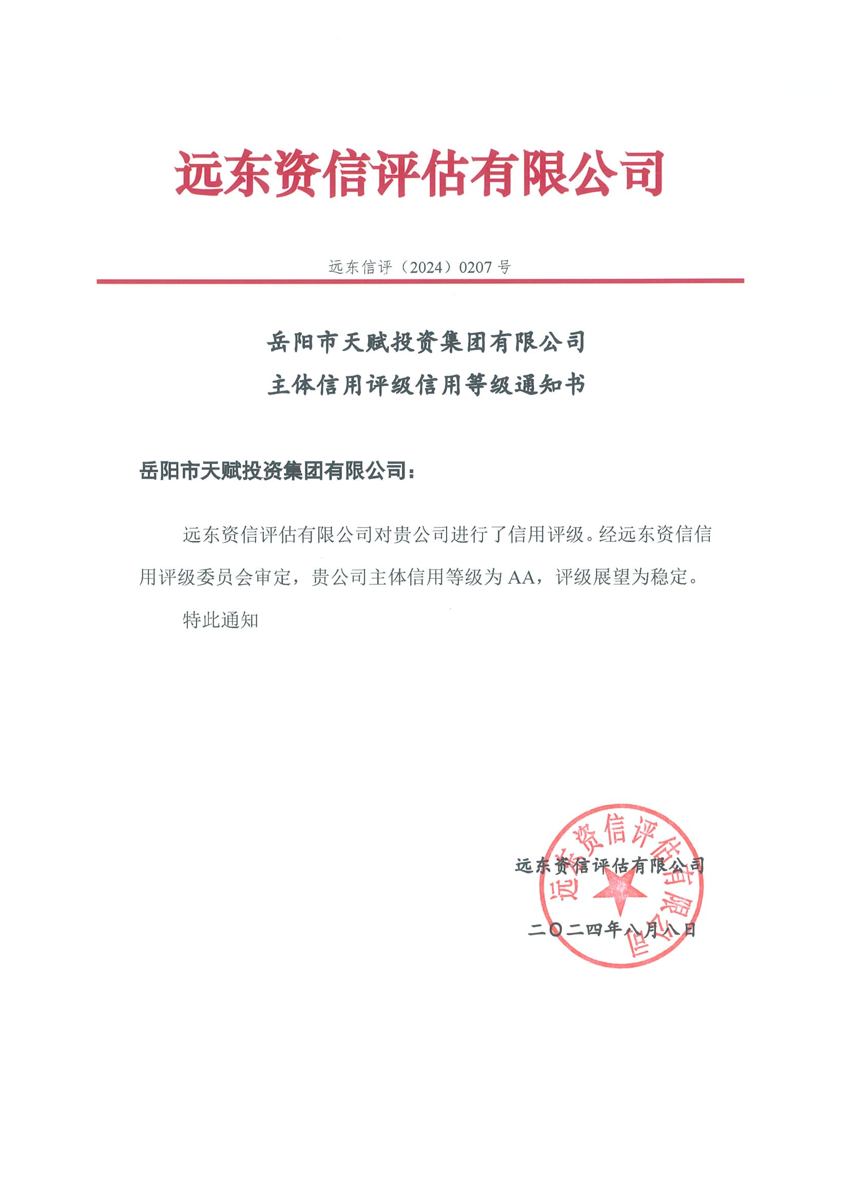 2024年8月8日,經(jīng)國內(nèi)權(quán)威評級機(jī)構(gòu)遠(yuǎn)東資信評估有限公司綜合評定,岳陽市天賦城市發(fā)展集團(tuán)有限公司獲評AA+主體信用等級,成為岳陽市第五家獲得AA+信用等級的市屬國企;岳陽市天賦投資集團(tuán)有限公司獲評AA主體信用等級,是岳陽地區(qū)唯一一個(gè)獲得AA主體信用評級的產(chǎn)業(yè)類投資企業(yè)。