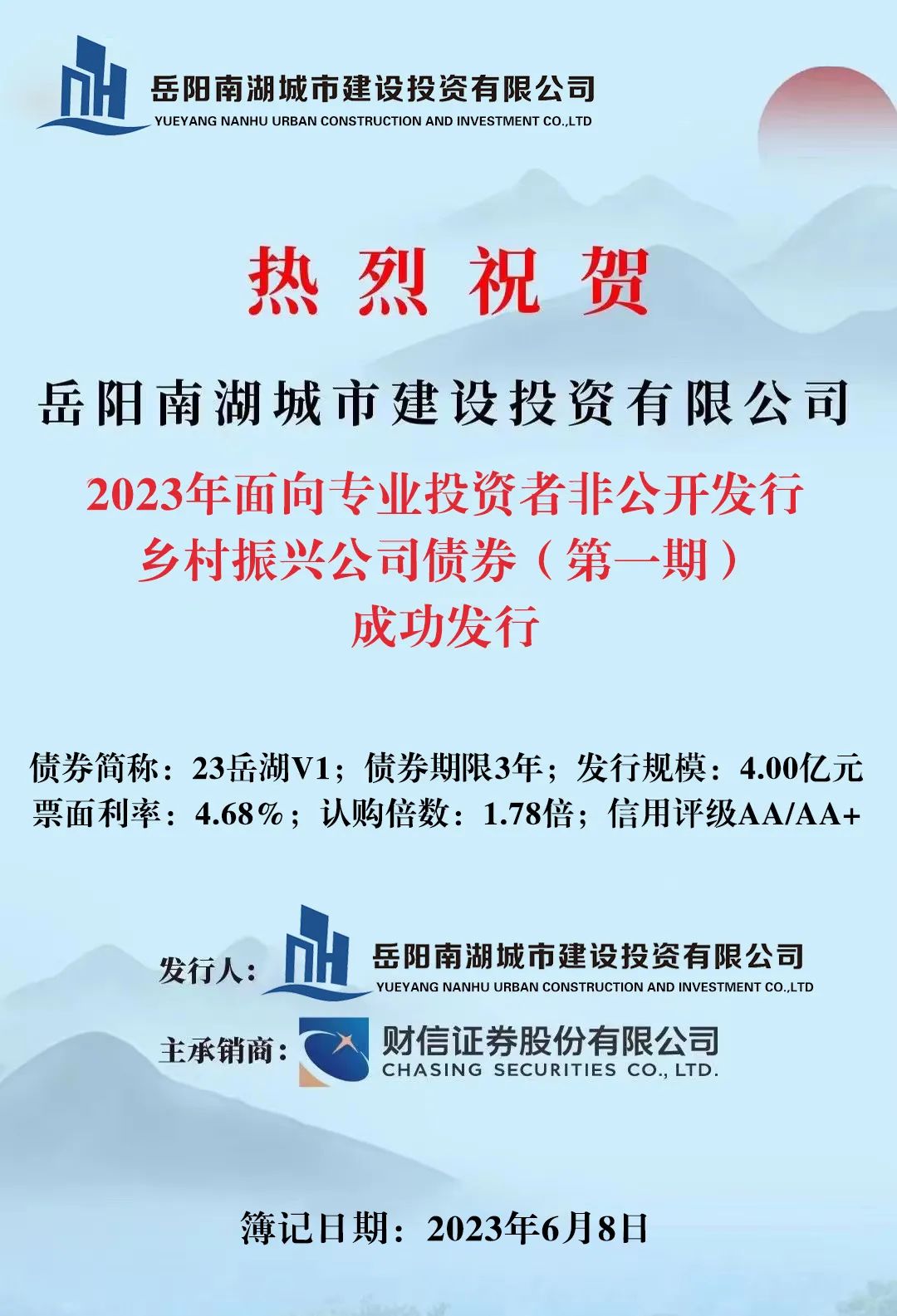 熱烈祝賀岳陽(yáng)南湖城市建設(shè)投資有限公司2023年非公開(kāi)發(fā)行鄉(xiāng)村振興公司債券(第一期)成功發(fā)行!