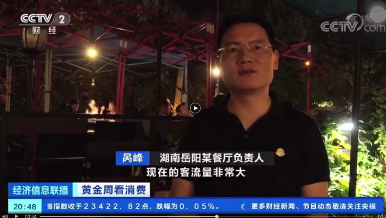 岳陽某餐廳負(fù)責(zé)人 咼峰:現(xiàn)在的客流量非常大,不管是中午還是晚上,基本上都是滿座的,后面幾天的預(yù)定都非常不錯(cuò),已經(jīng)預(yù)定了八九成了。