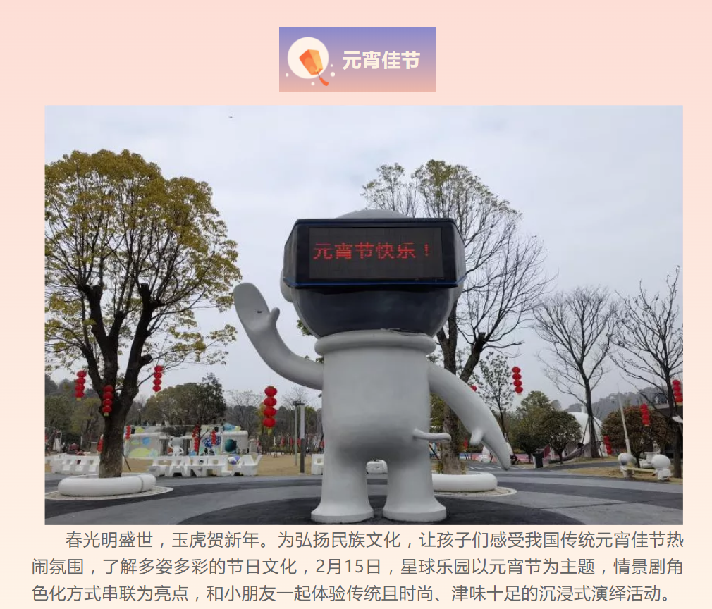 本次星球樂園元宵節(jié)主題演繹活動大獲成功,受到了孩子和家長們的一致好評,節(jié)日氛圍給孩子們留下了深刻的記憶點,為中國傳統(tǒng)節(jié)日文化與孩子們建立聯(lián)結(jié),進(jìn)一步讓孩子們深刻感受到傳統(tǒng)節(jié)日的歡樂氛圍和獨特的魅力。