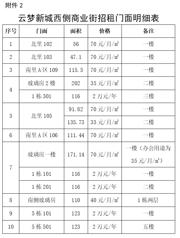 標的3:云夢新城西側商業(yè)街及配套房位于南湖新區(qū)云夢路,千畝湖對面,共9間商鋪和5套配套房可供出租(詳見附件表格),總面積1634.73平方米。其中一樓6間,月租金70元/平方米/月;二樓2間,月租金35元/平方米/月;配套房年租金2萬/年;玻璃房1間,月租金40元/平方米/月,首年度按8.5折進行優(yōu)惠,自第3個租賃年度起租金逐年遞增5%。